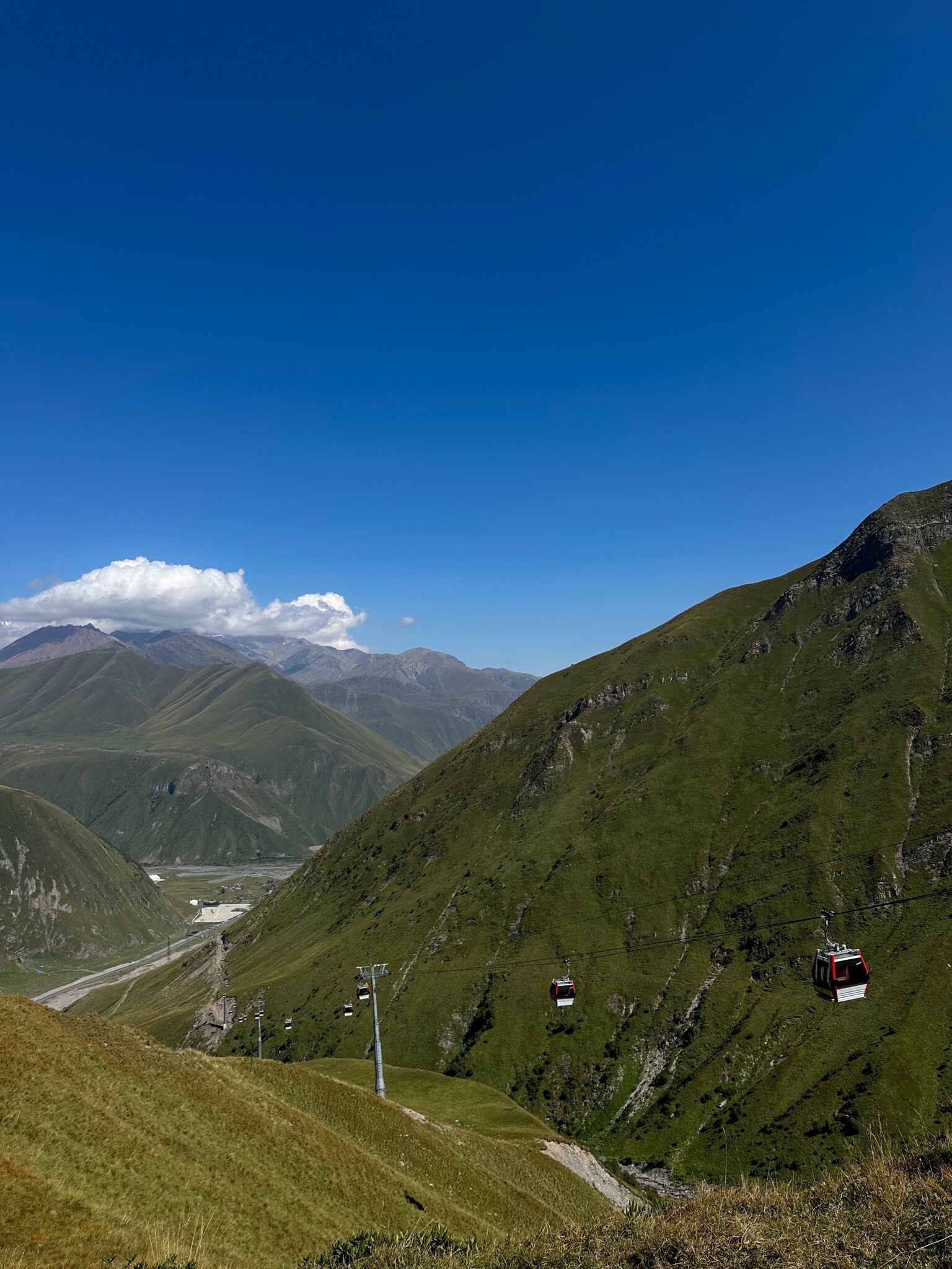 In de namiddag ruilen we de fietsen in voor een kabelbaan naar Gudauri, met fenomenale uitzichten over het skiresort en de omliggende bergen. De uitzichten zijn fenomenaal.