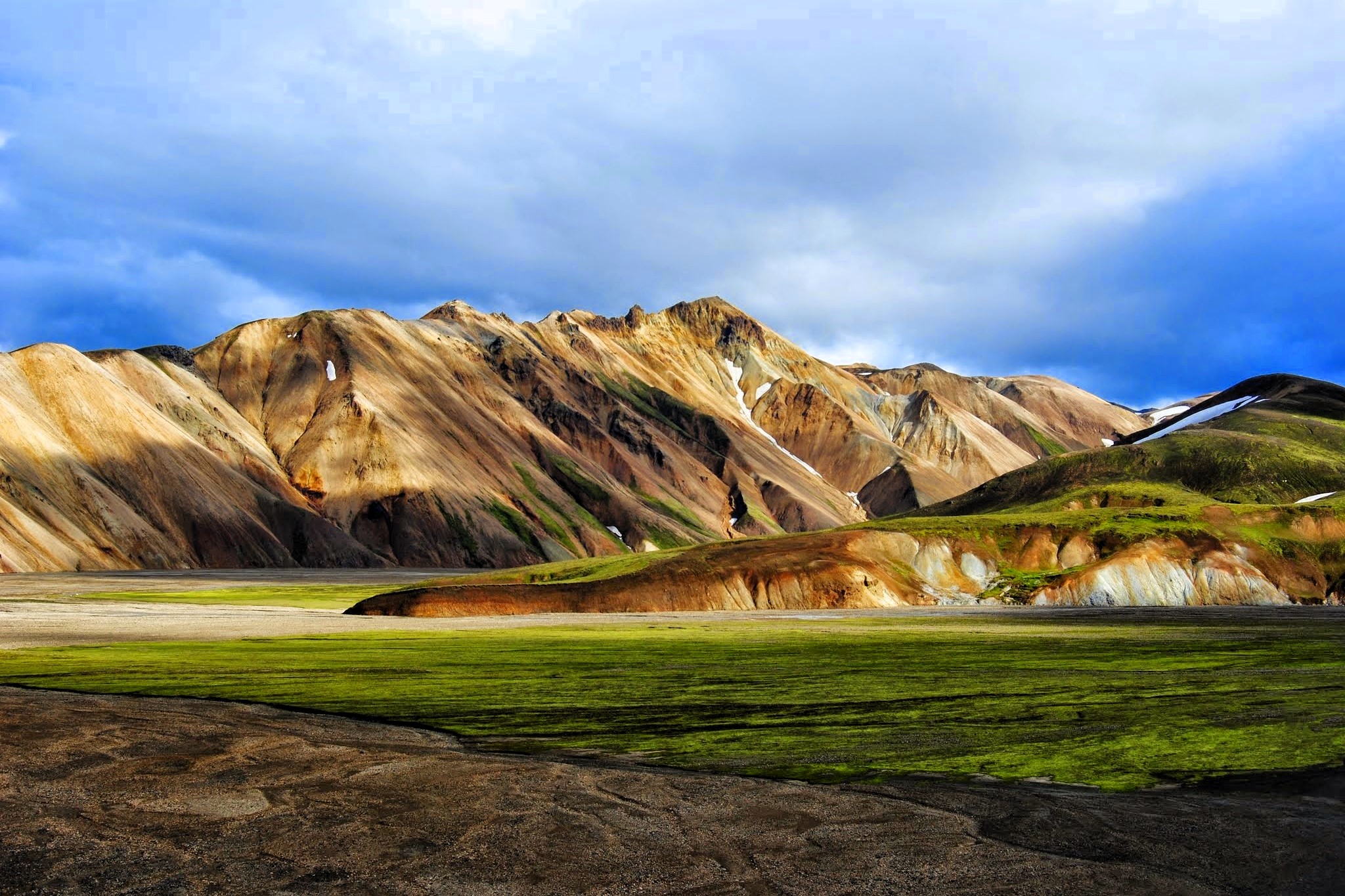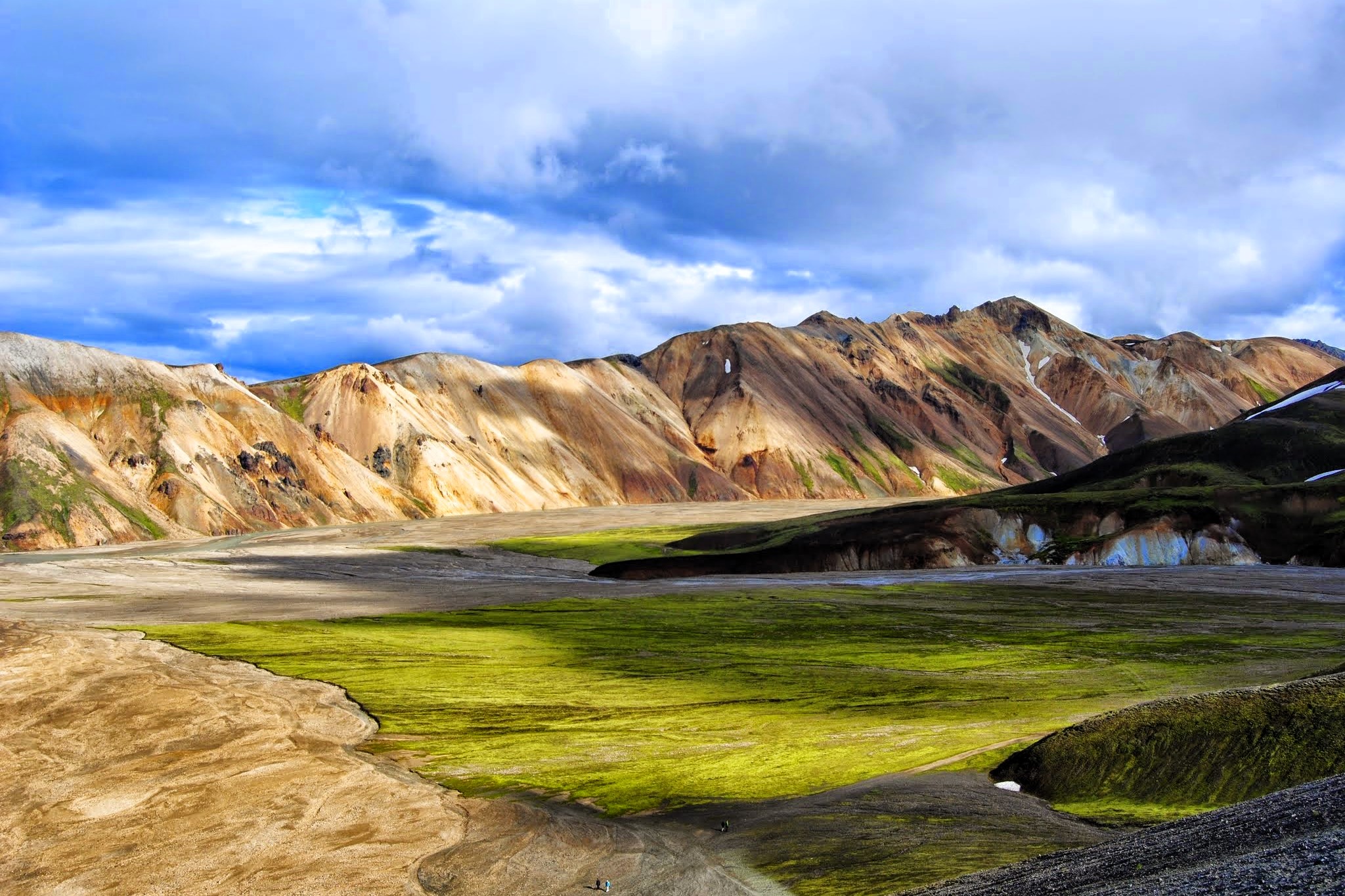We trekken langs grimmig gestolde lavavelden, indrukwekkende ravijnen, steile ryoliethellingen, panoramische bergtopen, rivieren en talrijke fumarollen en dampende zwavelbronnen.