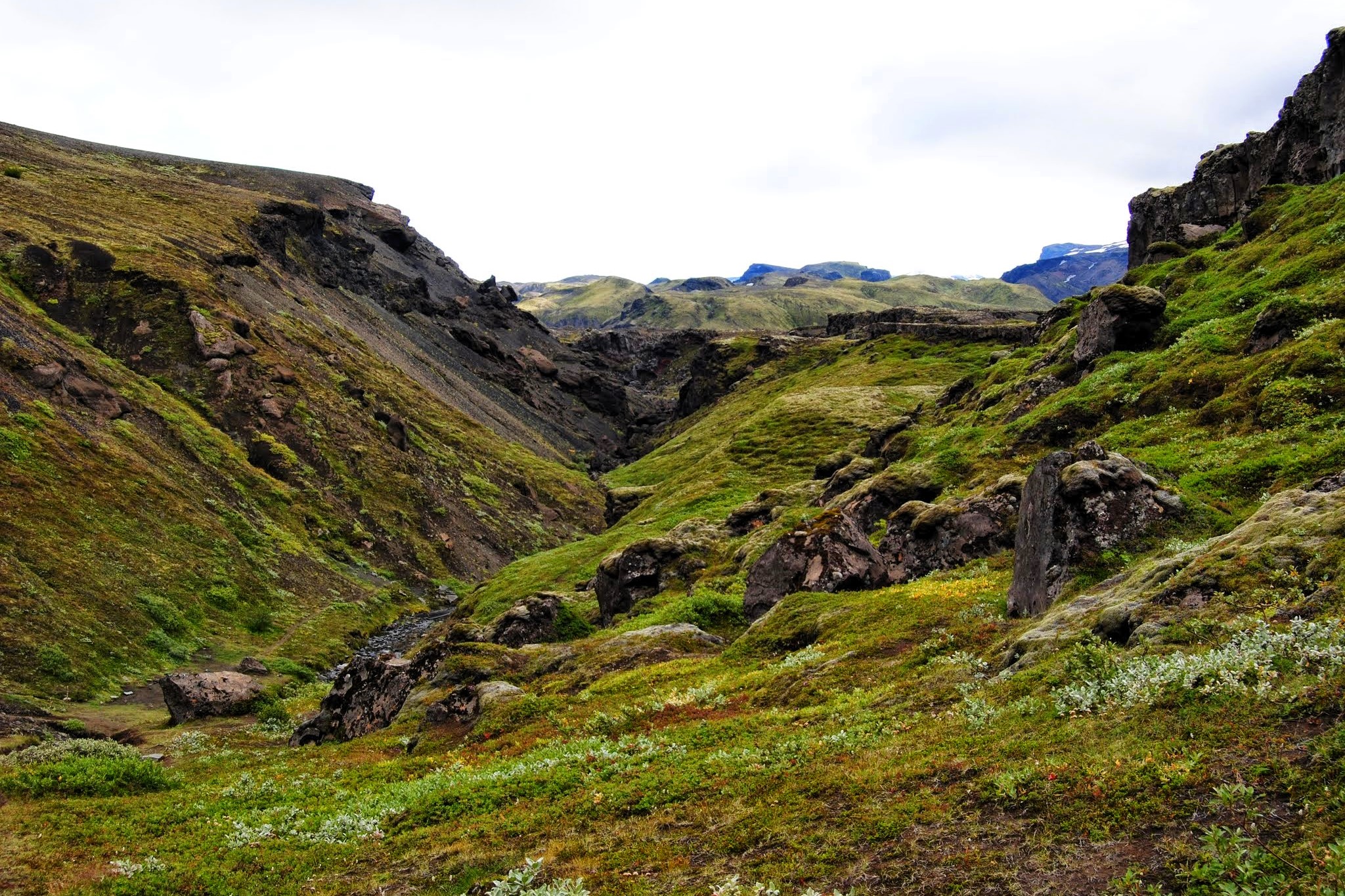 Op onze weg zien we hoe het gletsjerwater het tufsteen-gebergte aantast. Achteraan in de vallei liggen beschutte dalen met karakteristieke dwergberken, diepe smalle kloven en met bloemen bezaaide hellingen. Dit gebied is enkel met 4×4 voertuigen bereikbaar en we verblijven hier drie nachten.